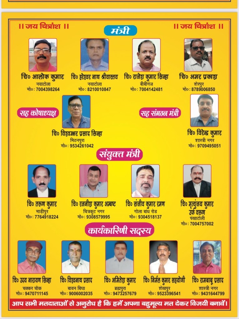 मुज़फ़्फ़रपुर में चित्रगुप्त एसोसिएशन का आगामी त्रिवर्षीय चुनाव (2025-2028) इस बार बेहद दिलचस्प मोड़ पर पहुँच गया है। वर्षों से स्थापित पूर्व कमेटी को चुनौती देने के लिए नए उम्मीदवारों का एक मज़बूत पैनल मैदान में उतर चुका है, जो परिवर्तन और पारदर्शिता के वादों के साथ मौजूदा व्यवस्था को बदलने का दावा कर रहा है।