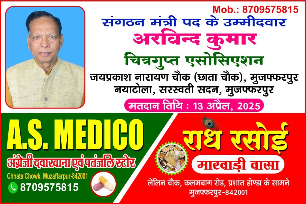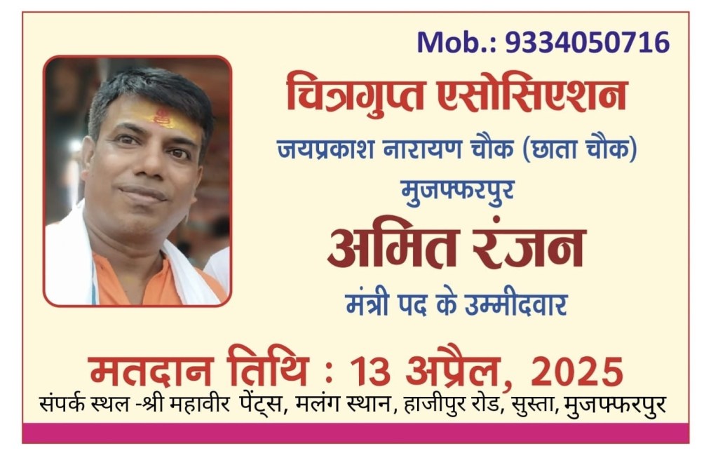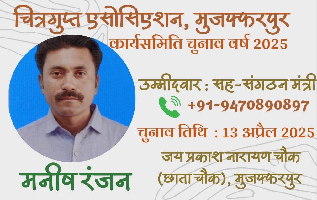 मुजफ्फरपुर। चित्रगुप्त एसोसिएशन, मुजफ्फरपुर के आगामी कार्यकारिणी सत्र 2025-2028 के चुनाव में राजेश कुमार सिन्हा “राजू” ने मंत्री पद के लिए अपनी दावेदारी पेश की है। वे डॉ. अजय नारायण सिन्हा के नेतृत्व वाले पैनल से चुनावी मैदान में हैं।