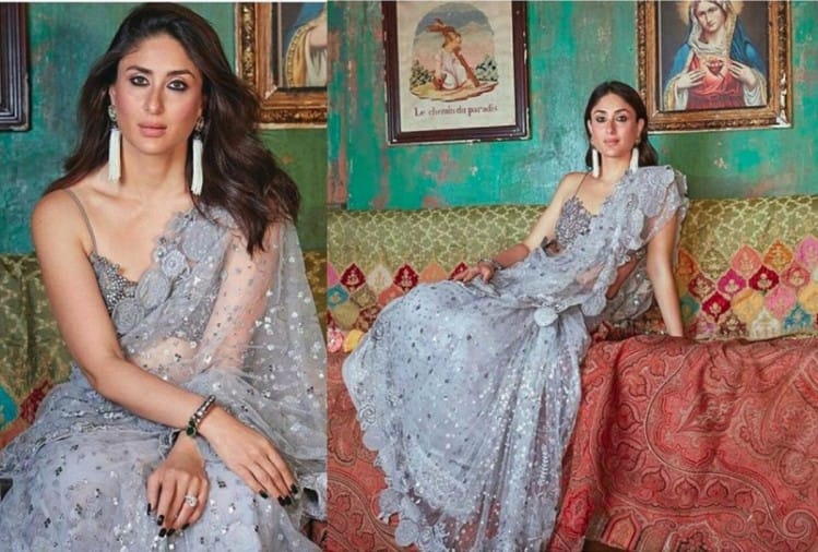 लैस वर्क पसंद करने वालो को देखकर ख़ुशी होगी कि लैस एक बार फिर फैशन ट्रेंड में है। नेट कि इस साड़ी के बॉर्डर पर लैस वर्क है। मैचिंग स्ट्रिप ब्लाउज और सफेद मोती के ईयररिंग के साथ लुक पूरा किया। महीन वर्क वाले इस अनारकली में करीना अपने बेगम के रौब में हैं।