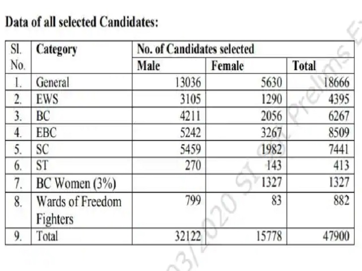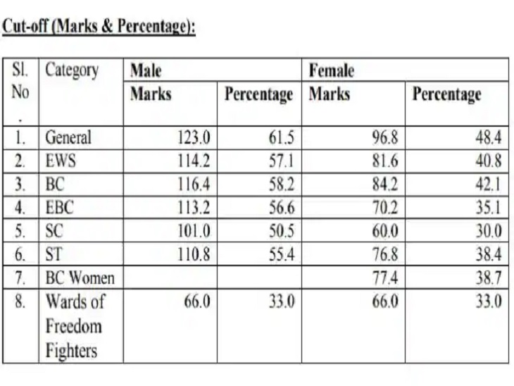 इस बार के रिजल्ट में जनरल फीमेल के 48.4% तथा जनरल मेल के 61.5% अभ्यर्थी सफल रहे। वहीं, EWS का 57.1% और फीमेल का 48.8% कट ऑफ रहा। EBC फीमेल का 42.1% और मेल का 58.2% रहा। इसके अलावा EBC 56.6% रहा, तो वहीं फीमेल का 35.1% कट ऑफ रहा। SC फीमेल का 30% रहा और मेल का 50.5% रहा। वहीं, ST का फीमेल 38.4% तो वहीं मेल का 55.4% रहा।